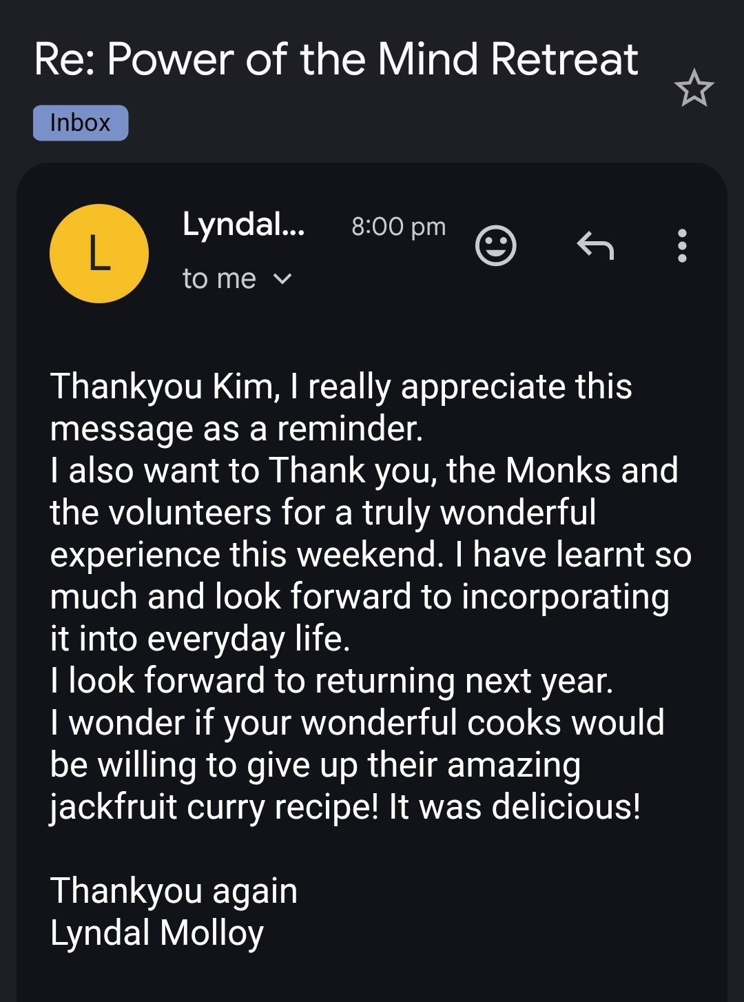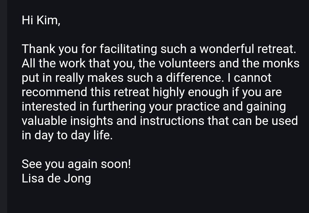 Thank you for facilitating such a wonderful retreat. All the work that you, the volunteers and the monks put in really makes such a difference. I cannot recommend this retreat highly enough if you are interested in furthering your practice and gaining valuable insights and instructions that can be used in day to day life.