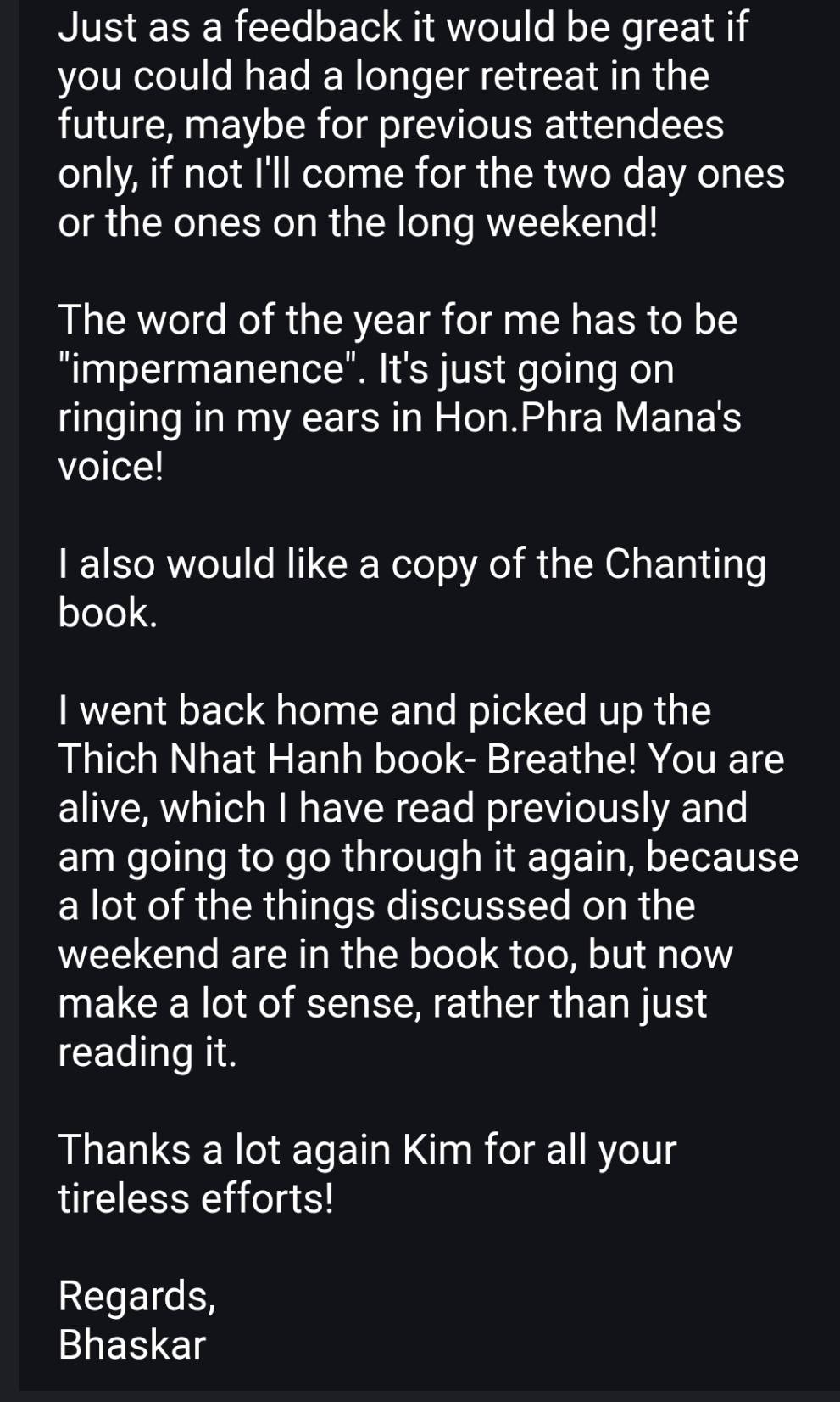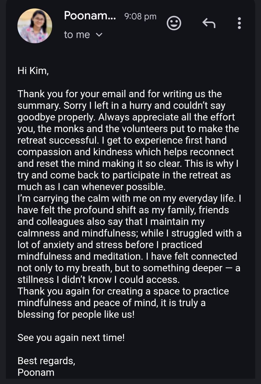 Thank you for your email and for writing us the summary. Sorry I left in a hurry and couldn’t say goodbye properly. Always appreciate all the effort you, the monks and the volunteers put to make the retreat successful. I get to experience first hand compassion and kindness which helps reconnect and reset the mind making it so clear. This is why I try and come back to participate in the retreat as much as I can whenever possible.