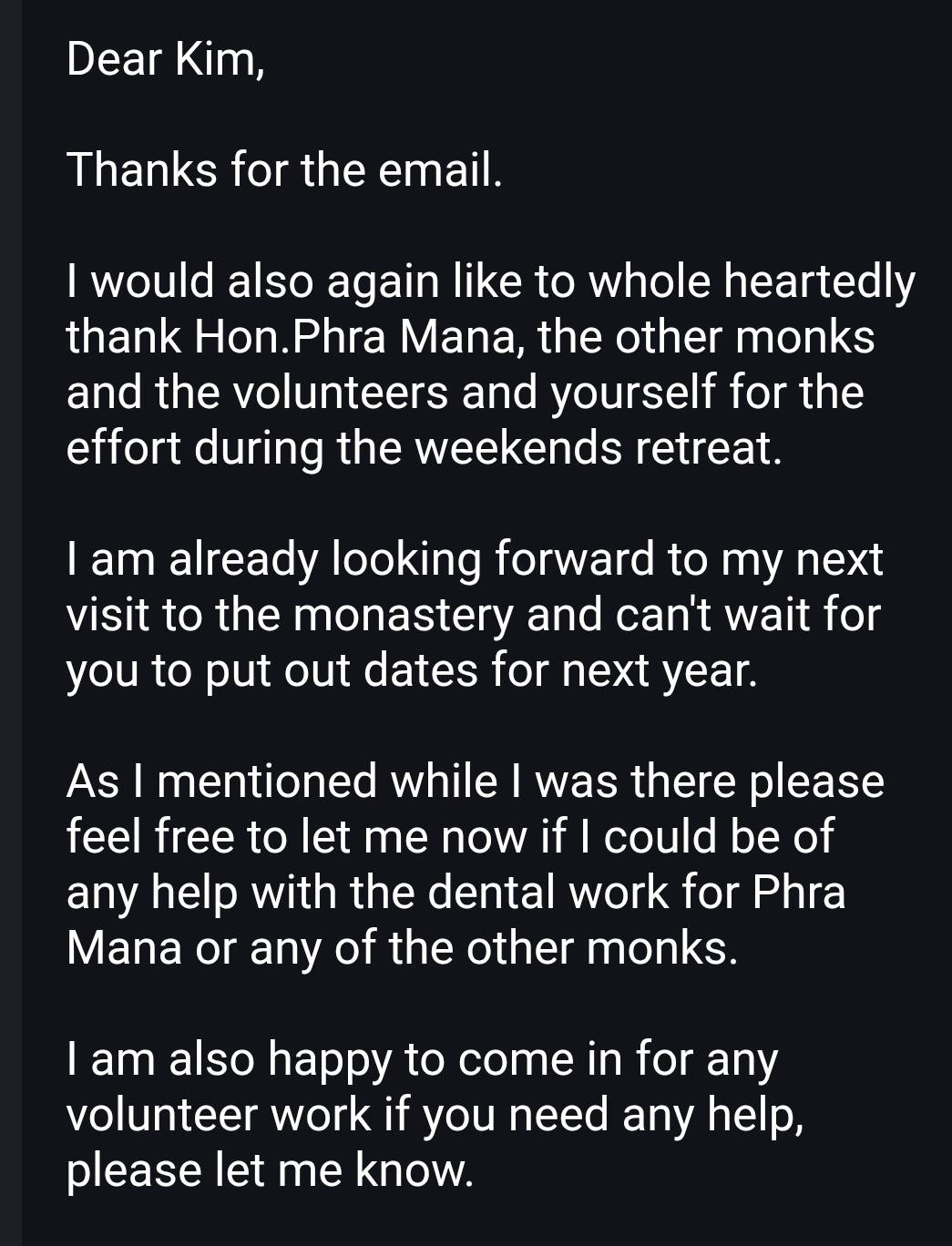 As I mentioned while I was there please feel free to let me now if I could be of any help with the dental work for Phra Mana or any of the other monks.